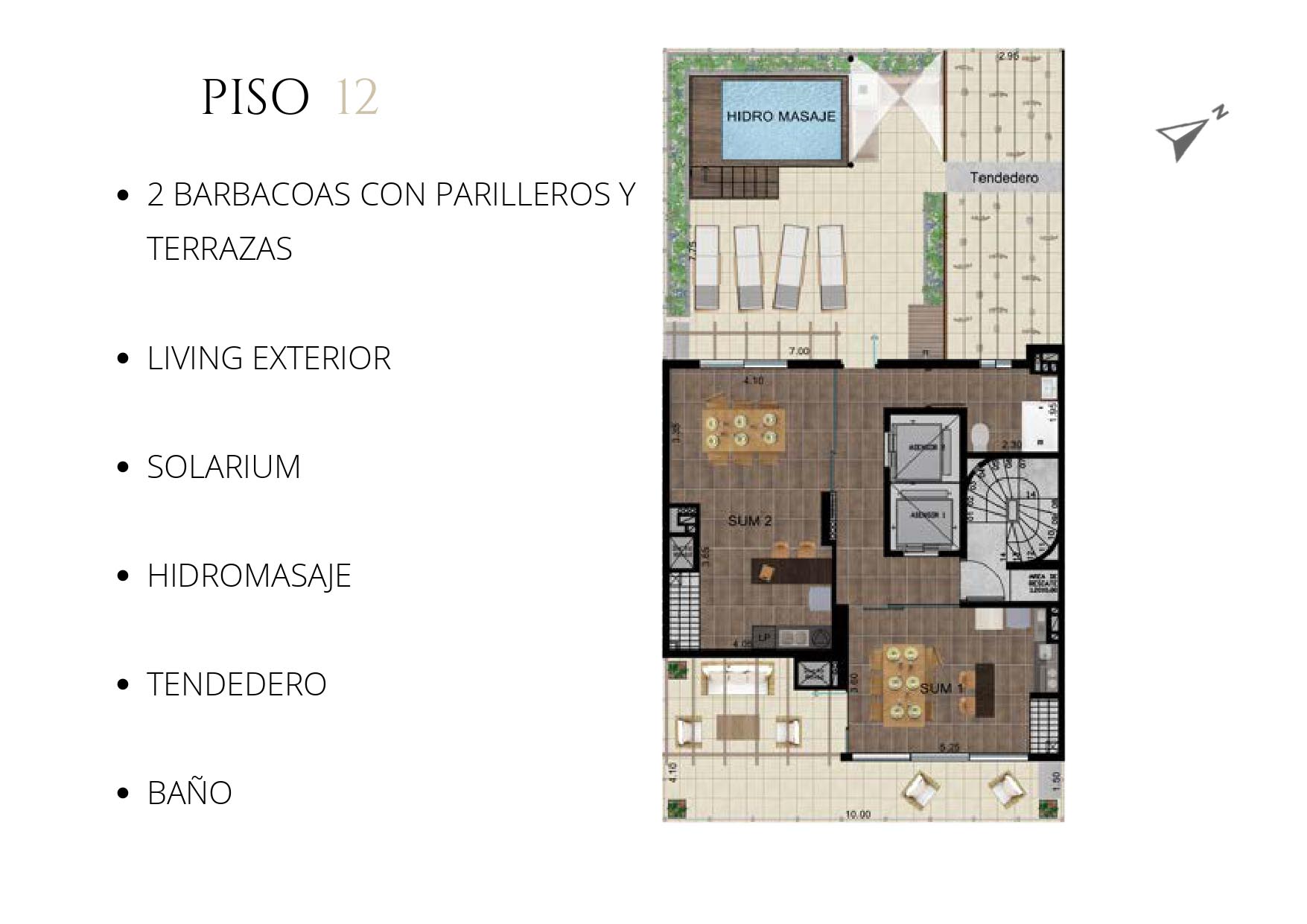 - Espacios Sociales Exclusivos: En el piso 12, los residentes pueden disfrutar de dos SUMS (Salones de Usos Múltiples) con parrilleros interiores, cocinas equipadas y aire acondicionado. Además, un solárium con hidromasaje proporciona un espacio perfecto para la relajación y el disfrute del sol.