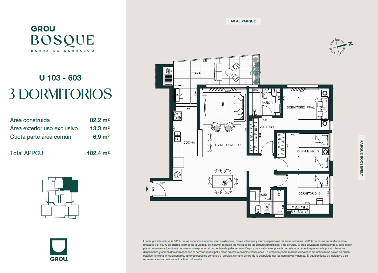 Unidad 103: 3 dormitorios y 2 baños ( uno en suite con vestidor). Living comedor con salida a gran terraza de 13mts. de uso exclusivo. cocina amplia semi integrada con barra divisoria, placares sobre y bajo mesada.