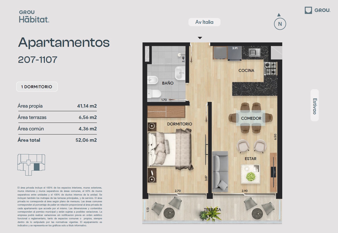 Grou Habitat, cuenta con terminaciones de alta calidad, destacándose por su aislación termo-acústica, aberturas de aluminio con DVH, pisos de porcelanato y vinílicos, entre otros detalles. Además, ofrece un ambiente amigable y práctico para una vida urbana dinámica, rodeado de servicios como hospitales, centros educativos, y comerciales.