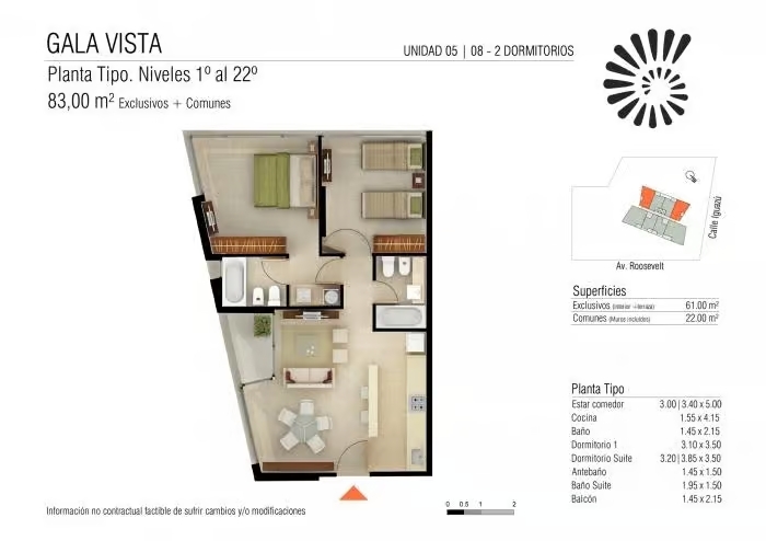 El edificio cuenta con 23 pisos que albergan departamentos de 1, 2 y 3 dormitorios, con superficies que varían desde 63.8 m² hasta 140.40 m². Las unidades están diseñadas con acabados de última generación, incluyendo aberturas exteriores de aluminio anodizado, pisos de porcelanato de gran formato, barandas de balcón con vidrio laminado de seguridad, y muebles de cocina modernos. Cada apartamento está equipado con horno y anafe de acero inoxidable y vitrocerámico, placares y vestidores de diseño exclusivo, e instalación de internet.