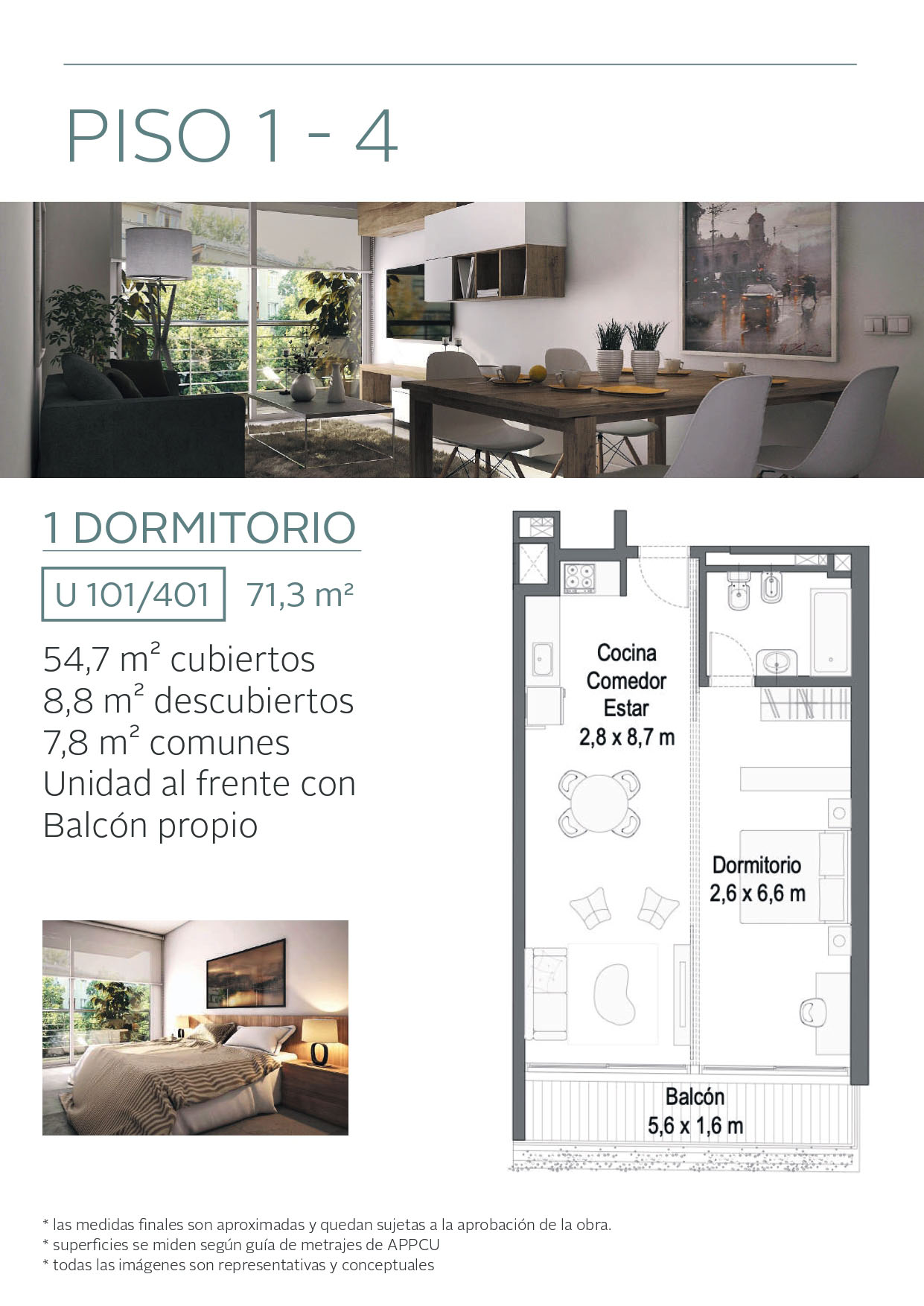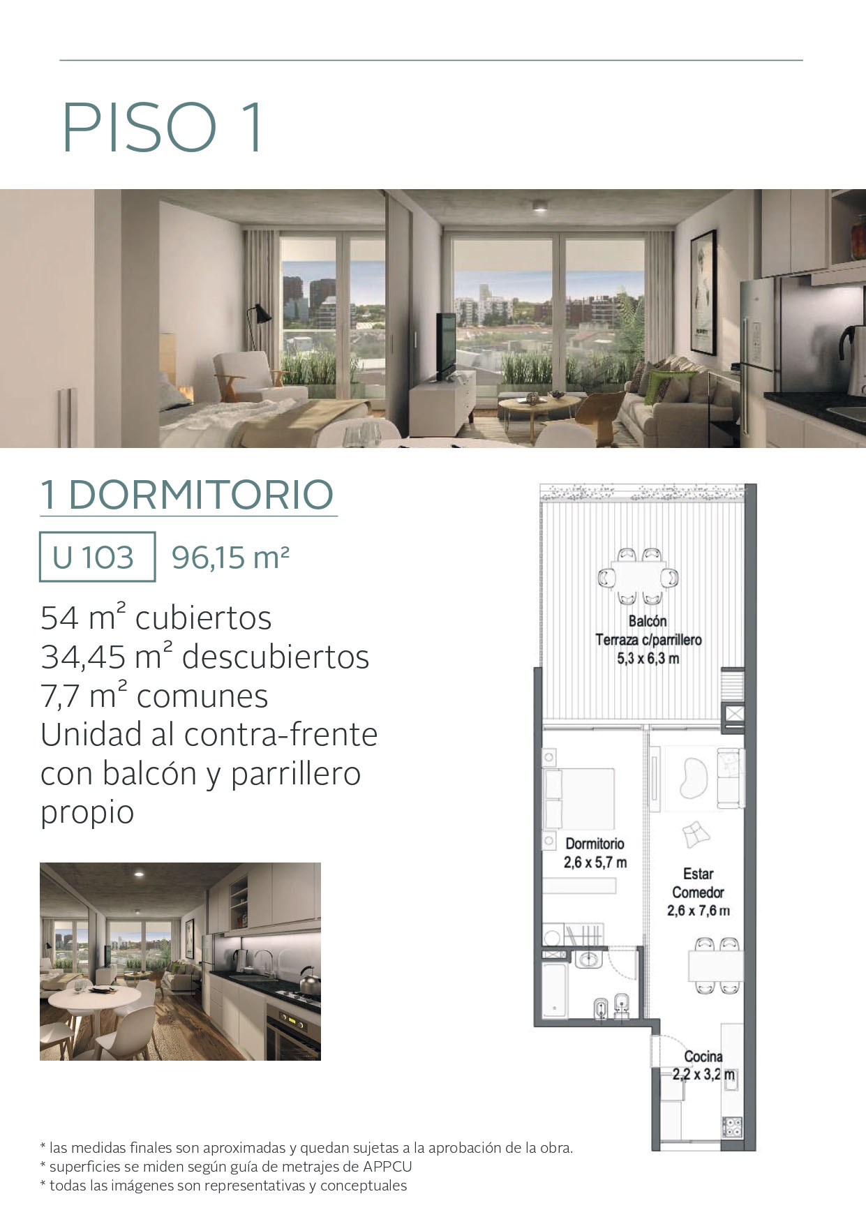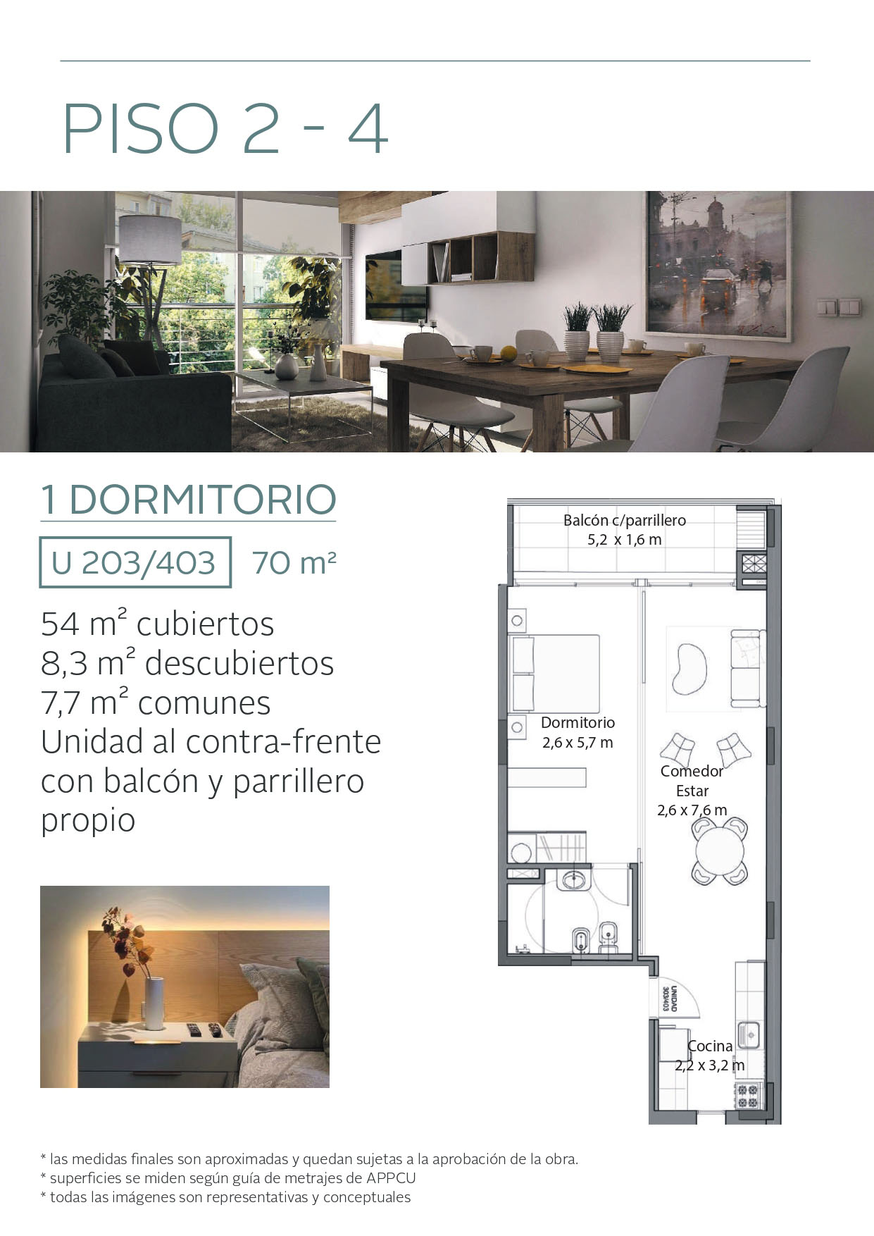 - Un Dormitorio: Unidades que van desde los 54 m², con opciones que incluyen balcones privados y parrilleros.