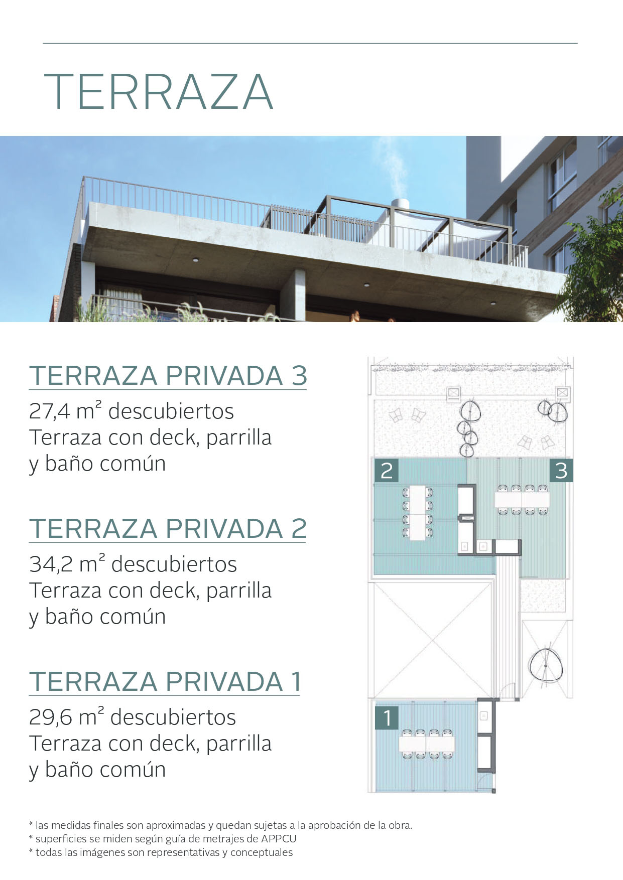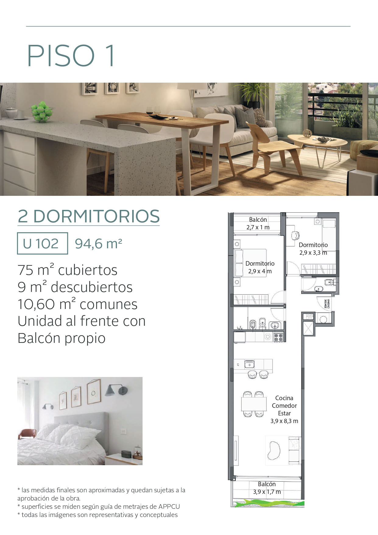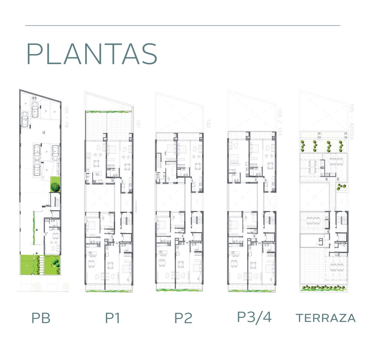 El proyecto se compone de un conjunto de dos edificios distribuidos en cuatro pisos, ofreciendo un total de 20 unidades residenciales. Entre estas, se encuentran 16 apartamentos de uno y dos dormitorios, un dúplex de dos dormitorios, y tres monoambientes. Todas las unidades han sido diseñadas para maximizar la luz natural, ofreciendo excelentes vistas urbanas y óptimo asoleamiento. Además, cada apartamento incluye terrazas, y algunas unidades disponen de patios exclusivos, lo que proporciona un espacio exterior adicional para el disfrute de los residentes.