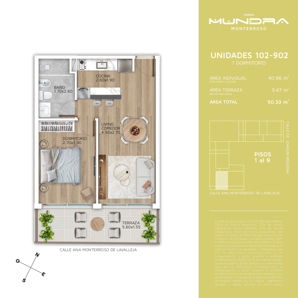 Unidad 102: 1 dormitorio y 1 baño al frente sobre calle Ana Monterroso de Lavalleja